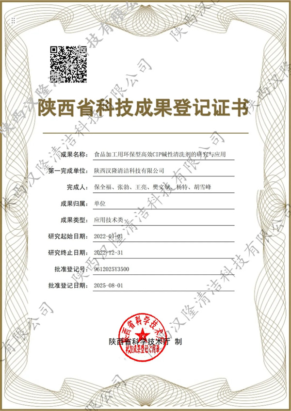 近日,陜西漢隆清潔科技有限公司自主研發的兩項科技成果——“食品加工用環保型高效CIP堿性清洗劑的研究與應用”和“食品級堿性泡沫清洗劑的研究與應用”,榮獲陜西省科技廳頒發的“陜西省科技成果登記證書”。這不僅是對公司在食品清潔領域創新研發能力的高度認可,更是為食品加工行業的綠色化、智能化發展注入了強勁動力。