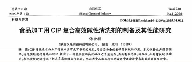 2、保全福在《山西化工》雜志發(fā)表論文《食品加工用CIP復(fù)合高效堿性清洗劑的制備及其性能研究》